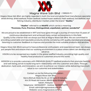 Magna Wave Sdn Bhd are highly regarded in both the local and global food manufacture specialist dried shrimp, dried seafood, frozen seafood. boiled frozen seafood, fresh seafood, live seafood, and fishing industry, distributor market under the brand “ Naafee “